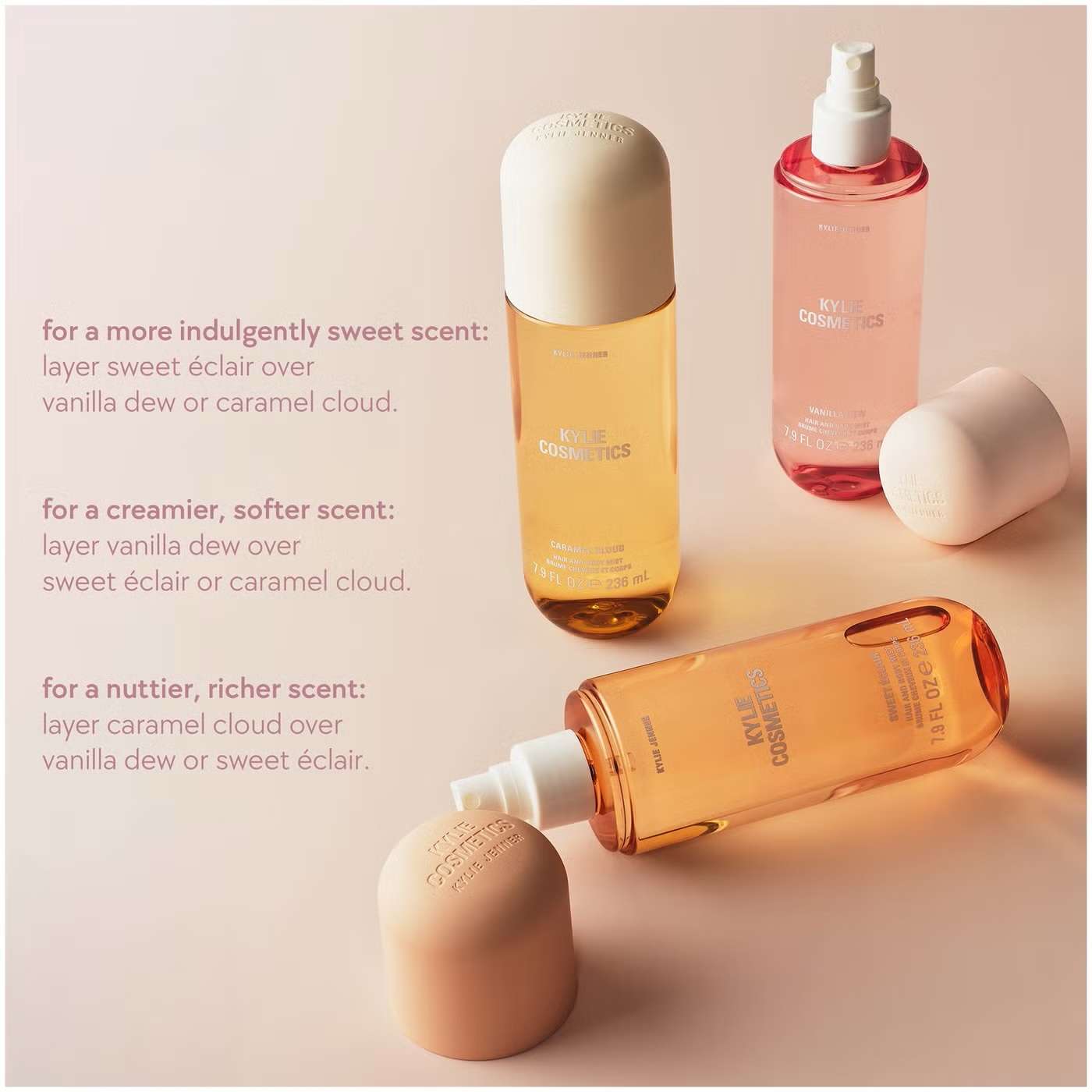 Diffuse the velvety warmth of Kylie Cosmetics Sweet Éclair Hair & Body Mist across your body. Smooth and decadent, the sweetness of this woody gourmand fragrance lingers on the skin. Desert-like notes of whipped chocolate cream blend with citrusy, powdery aromas of bergamot and Chantilly, swirling into a sweet patisserie base of vanilla.