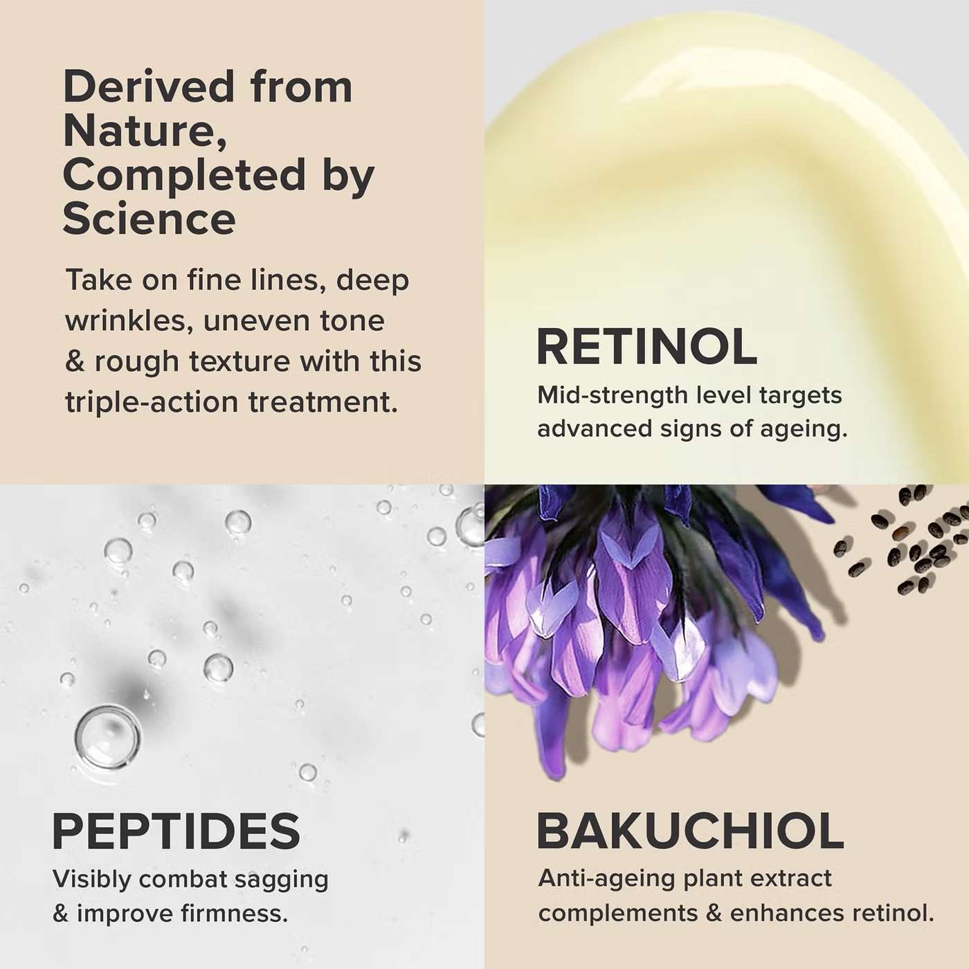 Triple-action retinol, bakuchiol and peptides support collagen-depleted skin to target fine lines, deep wrinkles, enlarged pores and loss of firmness.