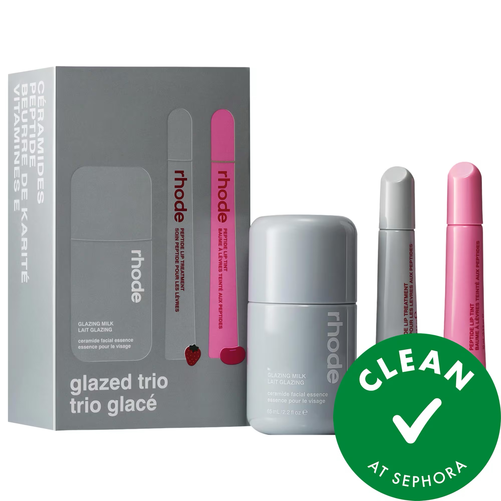 What it is: A set of three nourishing rhode essentials to glaze your skin and lips—featuring the Glazing Milk, Peptide Lip Tint, and Peptide Lip Treatment.